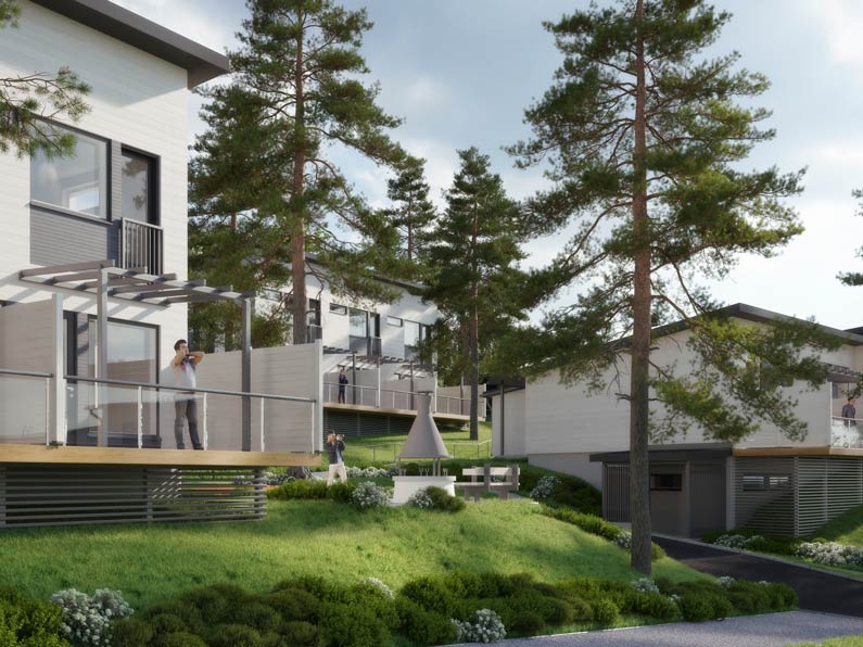 Jokaiseen asuntoon kuuluva Puustelli PRO -avokeittiö laadukkaine kodinkoneineen on erinomaisesti suunniteltu, samoin alakerran elegantisti sisustettu ja kalustettu kylpyhuone. Asuntoon kuuluva ulkovarasto ja muu kaappitila pitää puolestaan huolen, että säilytystilaa on riittävästi. Leveiden terassipihojen väliset korkeat seinämät ja tyylikkäät istutukset antavat rauhaa ja yksityisyyttä. Pihan parkkialueella riittää parkkipaikkoja jokaiselle kodille. Kodit lämpenevät ekologisesti maalämmöllä.