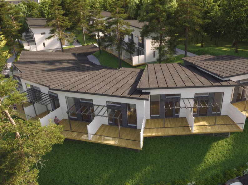 Kaksiot ja kolmiot ovat kooltaan 55 m2 ja 69 m2. Asunnoissa on 2-3 huonetta, keittiö, kylpyhuone ja sauna. Näyttävät 2-kerroksiset asunnot on varustettu isoilla ikkunoilla. Makuuhuoneet sijoittuvat yläkertaan, joten alakertaan jää reilusti keittiö- ja oleskelutilaa, joka jatkuu asunnon levyiselle terassille.
